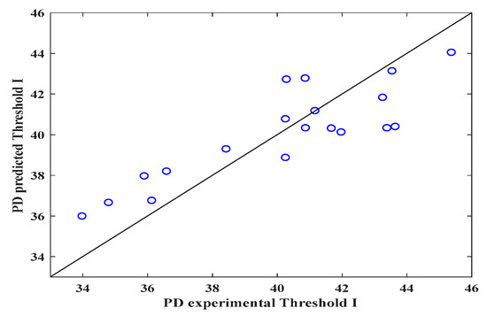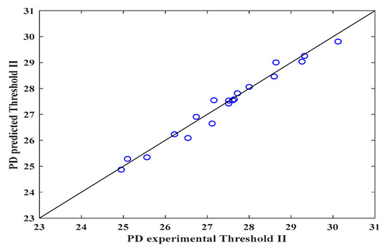 It is worth emphasizing that, for each threshold, the fractal exponent (n) of the mathematical expression is different. The statistical parameters (R2, R, RSS and MSE) for establishing the correlation between the experimental data and those predicted by the proposed equation are displayed in Table 4.