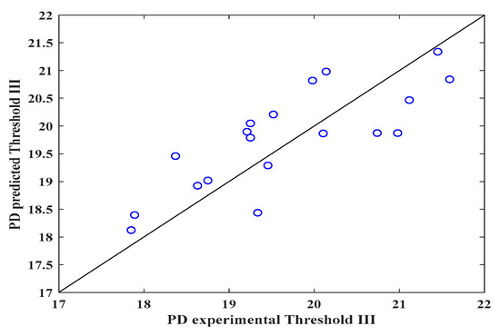 Conversely, Figure 4 shows that the mathematical expression improved the prediction (R2 = 0.97) with threshold II when the surface and intermediate layers of the electrospun veil SEM micrograph were employed, presenting the lowest RSS and MSE values, as observed in Table 4. Finally, in Figure 5, when threshold III was employed, once again the prediction diminished, due to the fact that the nanofibers overlapped, and the DP was reduced by the color contrasts.