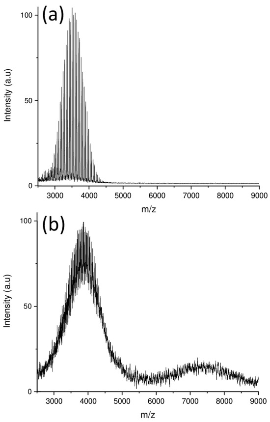 MALDI-TOF mass spectra of Star3600_2H (a) and Star3600_Hg (b).