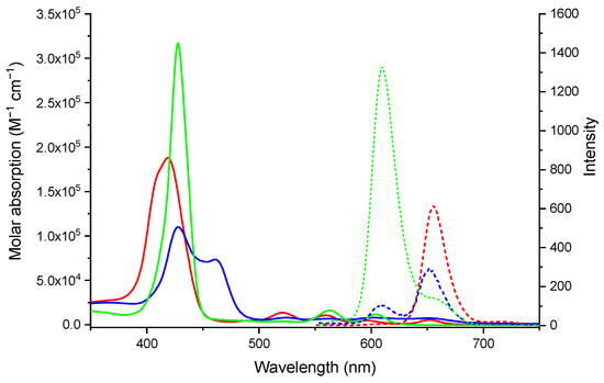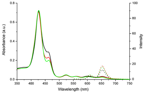 The UV-vis spectrum of Star3600_2H shows a Soret band at 419 nm and four Q-bands at 520, 559, 595 and 652 nm, respectively. As expected for metal porphyrins, Star3600_Zn (Figure 2, green line) shows a bathocromic shift of the Soret band of about 8 nm, which now appears at 428 nm, and the disappearance of two Q-bands, with the other two remaining at 563 and 603 nm (similar spectra are observed for all porphyrin–metal complexes, not reported for brevity). Typically, following Gouterman’s four orbitals model and due to the π → π* transitions between the HOMO and LUMO, the number of Q-bands arises from the combination of different electronic transitions involving the central metal ion and the porphyrin ligands [31]. In particular, when a metal ion is located between the pyrrolic nitrogens, due to an increase in the symmetry of the porphyrin itself, a decrease in the number of Q-bands occurs [41].