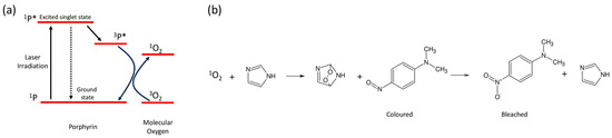 Porphyrins are widely used as photosensitizers thanks to their capability to generate reactive oxygen species when triggered by a suitable light source [42]. Indeed, once the photon is absorbed, determining an electron excitation from the ground state to the singlet state, the intersystem crossing process could generate an excited triplet state, in which energy might be transferred (in a non-radiative way) to the triplet ground state of the oxygen molecules (Figure 3a), generating singlet oxygen (1O2) species [43]. Usually, this last phenomenon is exploited in photodynamic therapy treatment.