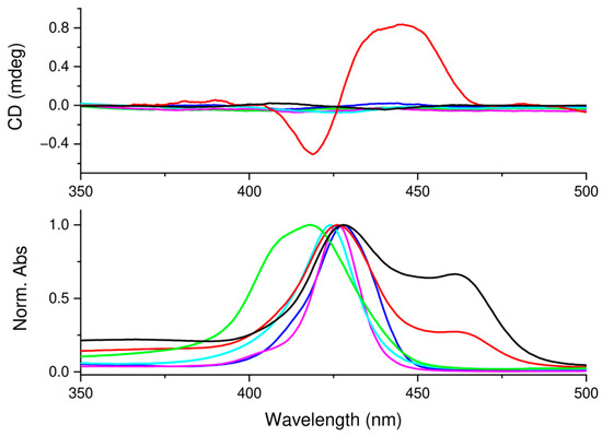 In addition to being used as photosensitizers for singlet oxygen production [45,46], some metal porphyrins are powerful macromolecular sensors for amino acids as well [47,48]. To verify the binding properties of the metal porphyrins (able to generate singlet oxygen) with respect to l-Trp, water solutions of Star3600_Me (4.6 × 10−6 M) were mixed with l-Trp in a molar ratio of 1:100, and UV-Vis and circular dichroism spectra were acquired. As expected, because the Er, Rh, Sn and Zn porphyrins do not form a stable chiral complex with l-Trp, silent circular dichroism spectra were recorded (Figure 4, green, cyan, magenta, blue lines, respectively).
