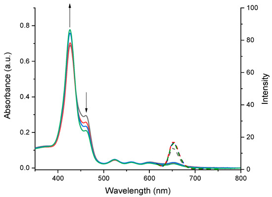 Specifically, the formation of the complex between Star3600_Hg and LSZ was investigated by means of absorbance and fluorescence spectroscopies. As shown in Figure 8, the formation of the complex leads to a decrease in the shoulder (λ = 461 nm) of the Star3600_Hg’s Soret band. Conversely, fluorescence spectra show an intensity increase upon the complex formation. These occurrences were similar to the one observed in the experiment involving l-Trp complexation, indicating the formation of the protein–porphyrin complex.