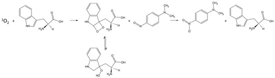 Considering that Star3600_Hg acts as an efficient sensor towards l-Trp creating a stable complex, and that l-Trp is potentially able to be an intermediate in the photo-oxidation mechanism, the features of both Star3600_Hg and l-Trp were investigated to determine the degradation of polypeptides containing l-Trp. In the supposed degradation mechanism, Star3600_Hg acts as a singlet oxygen source, while l-Trp serves both as a molecular target and as the singlet oxygen receptor. This interaction generates a peroxide species analogous to the mechanism observed with imidazole [52], capable of oxidizing the RNO system (Figure 6). Similarly, with the same mechanism, the system could be used to oxidize/damage the Trp-containing polypeptide. To validate this hypothesis, singlet oxygen detection experiments were conducted using l-Trp as the singlet oxygen intermediate receptor in place of imidazole.