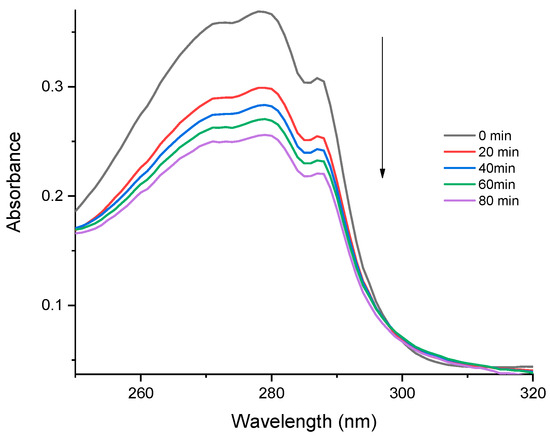 To shed light on the effect of Star3600_Hg acting as an artificial cleaving agent, l-Trp was used as a model since its residue can be found in many proteins. To verify that the formation of transannular species triggered by the porphyrinic photosensitizer induces the degradation of l-Trp, the disappearance of the peak at λ = 279 nm was monitored. Briefly, a 5 µM aqueous solution of Star3600_Hg was combined with l-Trp (ratio = 1:100) and irradiated with green or red laser light for a duration of 80 min. The change in its spectroscopic properties was observed by analyzing the same solution with absorbance spectroscopy (Figure 7), showing a strong decrease in the peak at λ = 279 nm (belonging to l-Trp). Similar results were obtained under green laser triggering. The experimental results confirm that, by exploiting this phenomenon, l-Trp can be a degradation site when located in protein chains.