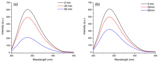 In both the green (Figure 9a) and red (Figure 9b) laser light irradiation experiments, performed with a mixture of Star3600_Hg as the photosensitizer and LSZ as the target, the fluorescence spectra of LSZ (λexc = 290 nm) show an emission band at 338 nm that decreases its intensity during the irradiation time, suggesting a denaturation/degradation phenomenon in the polypeptide. In the absence of Star3600_Hg, any significant change in the LSZ emission band is recorded.