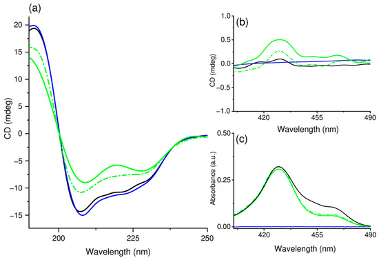 Considering that far-UV CD spectra of proteins can give information about their secondary structure [55], specific circular dichroism experiments were performed before and after green laser irradiation (similar results were also obtained with red laser irradiation). The CD spectrum of native LSZ (Figure 10a, blue line) shows a positive band at 192 nm (attributable to the α-helical [56,57]) and two negative bands at 207 nm (π-π* transition) and 220 nm (n-π* transitions of both random coil and α-helical structures [58,59,60]). These bands overlap with those of the β-sheet structure, with a positive band at 195 nm and a negative one at 218 nm [57,61]. After irradiation with the green laser for 40 min (Figure 10a, dashed green line) and 80 min (Figure 10a, solid green line), a strong decrease in positive and negative bands and a modification in the CD shape were recorded. In particular, the CD spectrum of the solution irradiated for 80 min showed huge shape modifications in the far-UV range attributable to the occurrence of random coil structure arrangements [61]. Finally, after laser irradiation, a small ICD signal appears in the metal porphyrin Soret region (400–490 nm, Figure 10b), suggesting that the cleavage of the protein is occurring, setting oligopeptide sequences in solution. These latter can interact with the free Star3600_Hg system, leading to the formation of oligopeptide–Star3600_Hg chiral complexes. Supporting this interpretation, a correlation between the irradiation time and the ICD signal intensity is observed. On the other hand, the UV-Vis spectrum of the irradiated complex (Figure 10c) shows a decrease in the intensity of the (Star3600-Hg)2 system’s band (461 nm), as previous observed in the interaction between (Star3600-Hg)2 and l-Trp.