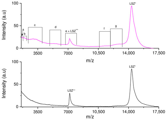 MALDI-TOF mass spectra of pristine lysozyme (black line) and Star3600_Hg-LSZ solution after 80 min of laser irradiation (magenta line). The symbols are explained in Table 3.