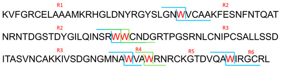 Finally, to have further confirmation of the scissor-like behavior of Star3600_Hg towards LSZ, the MALDI-TOF mass spectra of the pristine (Figure 11, black line) and 80 min irradiated (Figure 11, magenta line) Star3600_Hg-lysozime system were acquired. The MALDI-TOF spectrum of pristine lysozyme shows peaks due to the presence of the molecular species as single charge at about m/z 14400 (LSZ+) and double-charged species at about m/z 7200 (LSZ++). Instead, the irradiated mixture spectrum shows several broadened peaks, belonging to the different species originating from the cleavage of the sites where there are l-Trp residues, as shown in Table 3 and in Figure 12 (l-Trp residues are indicated with the red letter “W”). Based on the experimental data, we suppose that the aminoacidic sequence can be cleaved in every position (or neighboring to AA residues) where there are l-Trp residues. Similar results were obtained for both excitation wavelengths.
