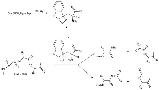 Lysozyme degradation can be explained by considering two pathways: (i) Protein denaturation, which occurs following the light-triggering of Star3600_Hg with the formation of singlet oxygen and the following radical species. The latter can react with the disulfide bonds of proteins, determining the partial denaturation of lysozyme [62,63]. (ii) Cleavage of the polypeptide chain, due to the peroxide intermediate on the l-Trp residue and the consequent formation of radicals [64,65] that determine the l-Trp degradation and/or the polypeptide scissoring mechanism [52,66] (Figure 13).