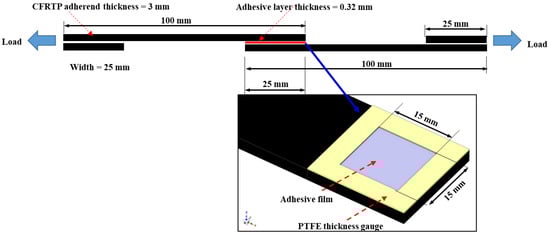 An epoxy adhesive film (Epoxy sheet 54, Singsung composite materials, Seoul, Republic of Korea) was selected for adhesive bonding. A thickness gauge of polytetrafluoroethylene (PTFE) tape (Air-tech, Huntington Beach, CA, USA) was selected to control the adhesive layer thickness and area (15 × 15 × 0.32 mm3). The epoxy file adhesives were cured for 2 h by the vacuum bag process for degassing using hot oven at 120 °C. Table 3 shows the material properties of the epoxy adhesive film obtained by the manufacturer.