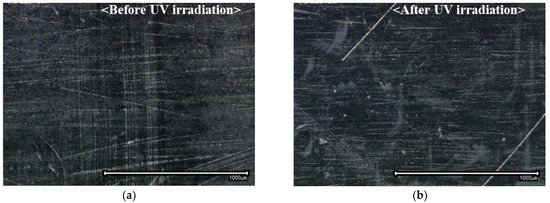 Figure 2 indicates the surface morphology of the CFRTP before and after UVC185+254 irradiation treatment for 300 min with an irradiation distance of 5 mm. Different from mechanical surface treatment such as sandblasting or sanding, there were no significant roughness changes or cracks to the surface morphology due to UVC185+254 irradiation. This finding proves that the UVC irradiation treatment did not cause critical damage that degraded the mechanical properties (fiber breakage, cracks on the surface matrix or delamination between the fiber and the matrix) to the surface of the PA6 matrix CFRTP within the UVC185+254 irradiation time. The relatively low energy of UVC irradiation compared with other energy-based surface treatment methods was the main factor [18].