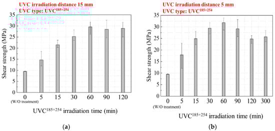 Shear bonding strength according to UVC185+254 irradiation time and distance: (a) 15 mm and (b) 5 mm.