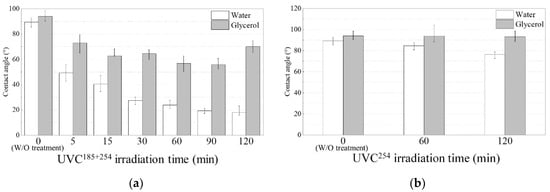 Distilled water and glycerol contact angles on the CFRTP surface with respect to the irradiation treatment time: (a) UVC185+254 and (b) UVC254.