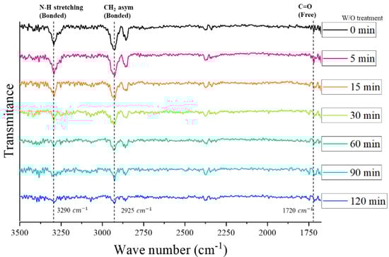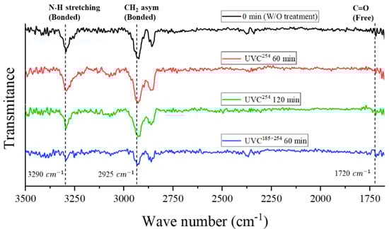 The ATR-FTIR method was employed to examine the surface of UVC-treated CFRTPs, aiming to analyze both functional groups and chemical alterations. Figure 6 shows the CFRTP surface FTIR spectra with different UVC irradiation treatment conditions. The peak at 3290 cm−1 corresponds to the N–H stretching vibration 38, and the peak at 2925 cm−1 corresponds to asymmetric –CH2– stretching vibrations. As shown in Figure 6, there are no changes in the peaks at 3290 cm−1 and 2925 cm−1 with UVC254 irradiation. For the case of UVC185+254 irradiation, in contrast, the peak intensities at 3290 cm−1 and 2925 cm−1 are markedly decreased, which means that UVC185+254 irradiation treatment chemically modifies the surface of CFRTPs. The energy (E) of UV light is given by Equation (3) [33]: