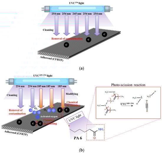 The surface modification of PA6 by UVC begins by eliminating organic contamination from the surface. The mechanism of UVC light cleaning and chemical modification is chiefly based on two wavelengths, 185 nm and 254 nm, as shown in Figure 7. UVC with wavelength lines at 185 nm generates ozone with O3 and atomic oxygen with O by photolysis of oxygen gas in an endothermic reaction. In contrast, UVC with wavelength lines at 254 nm is easily absorbed by the single C–C bonds of hydrocarbons and ozone. The UVC chemical modification process is a continuous oxidation process started at reactive oxygen (and carbon) radicals [37,38]. Of course, no surface cleaning (remove the contaminate) can be expected from low-energy UVB surface treatment, and therefore, it has no effect on improving the adhesion-bonding strength of the CFRTP.