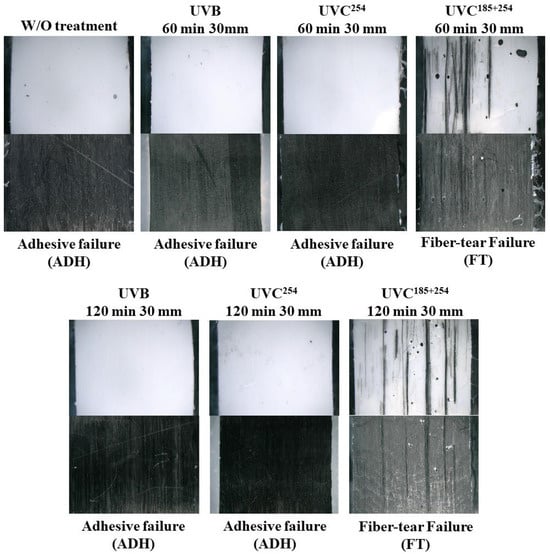 The interface of an adhesive layer on a CFRP is composed with the matrix surface not directly bonding with fiber reinforcement. The failure modes of the adhesive bonding are categorized as cohesive failure, interface failure, fiber-tear (substrate) failure, and light tear failure [40]. Figure 9 shows the fracture surface images of the single-lap shear adhesive joint with respect to the type of UV treatment. In the absence of UV irradiation treatment, adhesive failure (ADH) occurred as a result of a weak interface between the epoxy adhesive layer and pure CFRTP surface. ADH was the dominant failure mode even for the UVB- and UVC254-treated CFRTP specimens. However, the fiber-tear failure (FT) mode was observed for the case of CFRTPs treated with UVC185+254. The interfacial bonding strength between the epoxy adhesive and the CFRTP adherend was obviously enhanced by the UVC185+254 irradiation. UVB and UVC254 irradiation cannot sufficiently modify the surface to enhance the interfacial bonding between the adhesive and the CFRTP surface.