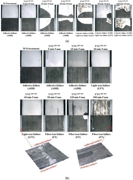 Fracture surfaces and failure modes of an adhesive joint according to the UVC185+254 irradiation time. Irradiation distance: (a) 15 mm and (b) 5 mm.