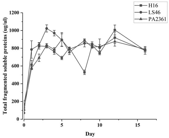 The three species of bacteria were cultured in minimal PE media with LDPE as the sole carbon source, and growth curves were used to determine the cell mass increase (Figure 1). The presence of LDPE powder in the media causes interference in the OD600 readings; thus, the growth curves were based on the total soluble protein extracted from cell pellets after various times of incubation. The three bacteria grew rapidly during the first 2 days of incubation. As the bacteria grew on LDPE as a sole carbon source, it was assumed that the bacteria secreted enzymes that degraded the LDPE into smaller fragments that were assimilated and catabolized by the bacteria. Indeed, fragments generated by LDPE hydrolysis were detected in the supernatants of the bacterial cultures. The degradation products detected were identified as n-heptane (C7 alkane), undecane (C11 alkane), and a number of unknown products.