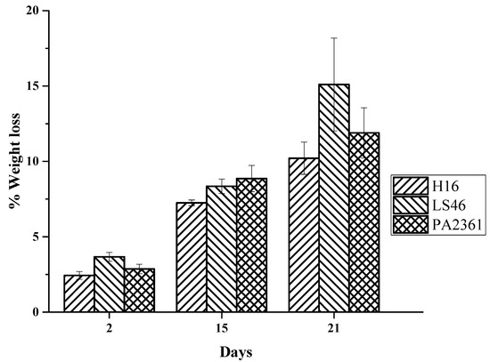 The LDPE weight loss increases the longer the incubation period. The LDPE percent weight loss ranges from over 2% after 2 days of bacterial incubation to over 7% on Day 15. The % weight losses on Day 21 were 10 ± 1%, 15 ± 3%, and 12 ± 2% for C. necator H16, P. putida LS46, and P. chlororaphis PA2361, respectively (Figure 2).