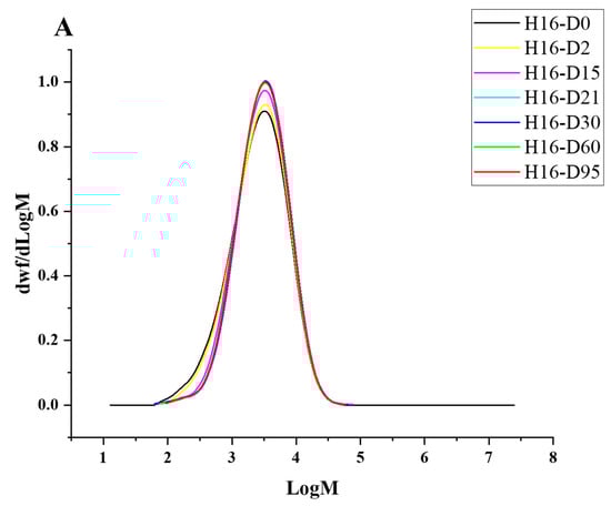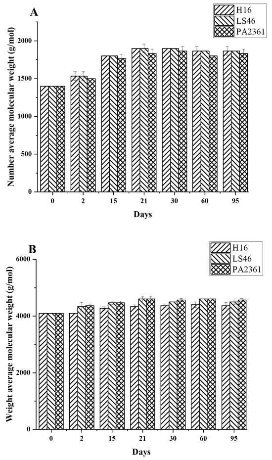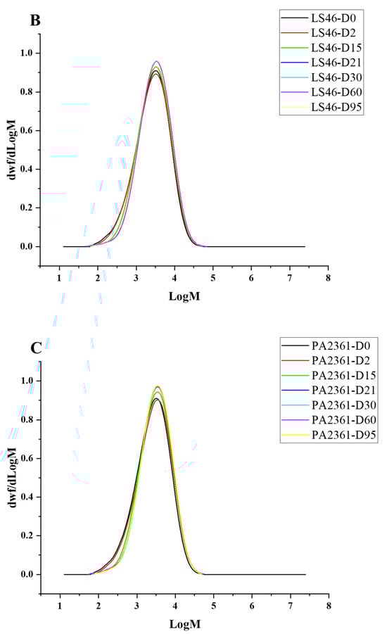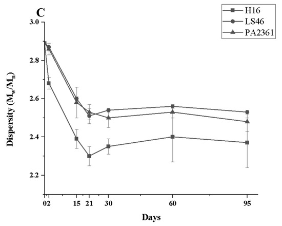 Degradation to the LDPE structure was confirmed with HT-SEC. According to the results, both the weight-average molar mass (Mw) and number-average molar mass (Mn) increased as the incubation period length increased (Figure 3A,B). LDPE incubated with P. putida LS46 and P. chlororaphis PA2361 showed a significant increase in the Mw and Mn values after 2 days of bacterial incubation, but the dispersity (Đ) did not show significant changes until Day 15 (Figure 3C). In contrast, LDPE incubated with C. necator H16 did not display changes in the Mw after 2 days, but the Mn and Đ values showed significant changes compared to the control. In 2 days, the Mn value of LDPE incubated with C. necator H16 increased to 1530 g/mol, while the Đ decreased from 2.89 to 2.68. At Day 15, all three bacteria-treated samples showed similar trends in which the Mw and Mn values increased, and Đ decreased significantly. Additionally, the distribution of polymer molar mass was narrower as the length of the incubation period increased (Figure 4). The changes became insignificant after 21 days for all three bacteria and the polymer structure stayed approximately the same till Day 95.