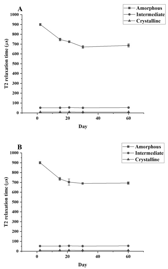 where, Ac, Ai, and Aa are the signal amplitudes of the crystalline, intermediate, and amorphous component, respectively. Tc, Ti, and Ta are the T2 relaxation times of these components in µs.