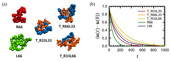 where the constant k is determined to be 1.56 based on the simulation data for the T_R33L33 chain. Additional variables can be extracted from the simulation data pertaining to the pure L33, L66, R33, and R66 chains. For example, based on the conventional scaling expressions for pure linear and ring chains (i.e., and ), the and factors were estimated to be approximately 3.25 (=L66/L33 = = ) and 3.46 (=R66/L33 = = ), respectively. Here, the rotational time of the tadpole chain is assumed to be the sum of the rotational times of the corresponding pure ring chain and pure linear chain. of the tadpole chain, calculated using Equation (7), is listed in Table 5 and agrees well with the simulated rotational time obtained from the BD simulations.