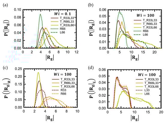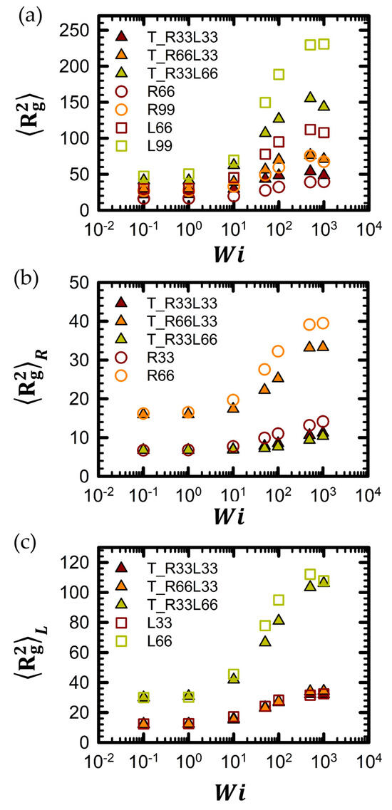 Pure ring polymer chains generally exhibit smaller chain dimensions than their linear counterparts with the same molecular weight, both at equilibrium and under flow conditions [32,47,48]. Thus, tadpole polymer chains with a higher proportion of ring units are expected to have smaller overall chain dimensions at the same molecular weight. As shown in Figure 3a, at the same Wi, the overall chain dimensions of the polymer chains decrease in the following order: L99 > T_R33L66 > T_R66L33 > R99. This trend is consistent with our expectations.