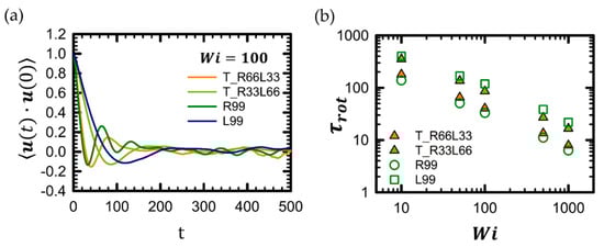 The time correlation functions (TCF) of the chain unit end-to-end vector, u, provide significant insights into the rotation and tumbling behavior of the chain. Figure 6a displays the time correlation function of the chain unit end-to-end vector, u, for the tadpole chain under strong shear flow. The chain rotational time was computed using a simple exponential decay function for Wi < 10 and estimated from the characteristic negative minimum of the time correlation function for Wi > 10. The rotational times of the tadpole chain as a function of Wi are shown in Figure 6b. Generally, pure ring polymer chains exhibit faster chain rotation times compared to their linear counterparts of the same molecular weight [32,47]. Therefore, at the same molecular weight, tadpole chains with a higher proportion of ring units are expected to have faster chain rotational times.