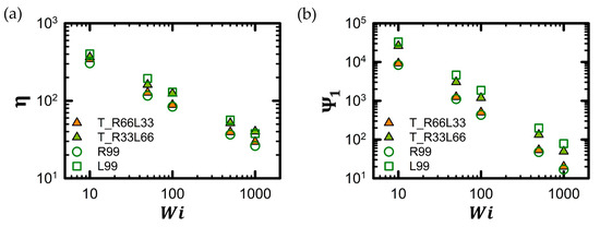 Figure 7b also shows the typical shear-thinning behavior for the first normal stress coefficient, , for all tadpole polymer chains. The power law expression was used to measure the degree of shear thinning for , and for was measured as 1.37 for pure L99 chain, 1.40 for pure R99 chain, 1.39 for T_R66L33, 1.38 for T_R33L66 chain. This agrees well with previous findings for polymeric liquids [1,2,3,4,5,6,7,47,48,82,91,94]. Similar to the macroscopic viscosity, also decreases as the proportion of the ring part in the tadpole chain increases. Therefore, increases in the order of pure R99 chain < T_R66L33 chain < T_R33L66 chain < pure L99 chain across the entire range of Wi.
