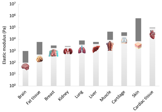 Soft tissues in the human body exhibit a wide range of elastic moduli, reflecting their diverse mechanical functions and structural roles (Figure 1). For instance, the elastic modulus of lung tissue is relatively low, ranging from 1 to 6 kPa, which supports its role in accommodating repetitive breathing motions and maintaining flexibility during respiration [9]. Adipose tissue, which serves as a cushion and energy store, also demonstrates low modulus values but varies depending on fat type and location [9]. For example, the modulus of subcutaneous fat is generally lower compared to visceral fat, reflecting different functional requirements and mechanical properties. On the other hand, tissues such as skin, which need to withstand external forces while maintaining elasticity, exhibit higher moduli, typically ranging from 10 to 100 kPa [9]. These variations in elastic modulus are crucial for the tissues’ ability to perform their specific biological functions effectively, from cushioning and flexibility to structural support and protection.