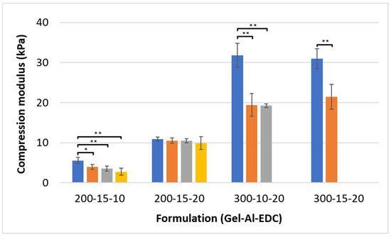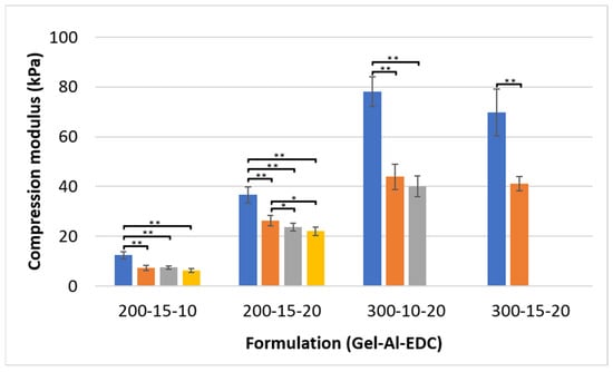 Compression modulus of hydrogel cylinders after 24 h of immersion in water. Hydrogel formulations are noted on the x-axis as Gel-Al-EDC, and foaming ratios (polymer:air) are represented by different bar colors: ■ non-foamed; ■ 2:1; ■ 1.5:1; ■ 1:1. A p value of <0.05 and <0.001 is marked with an * and **, respectively.