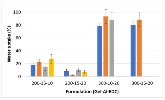 Water uptake as percentage weight gain in 24 h as a measure of water uptake of hydrogels with different concentrations of gelatin, alginate, and EDC (Gel-Al-EDC). Foaming ratios (polymer:air) are represented by different colors: ■ non-foamed; ■ 2:1; ■ 1.5:1; ■ 1:1.