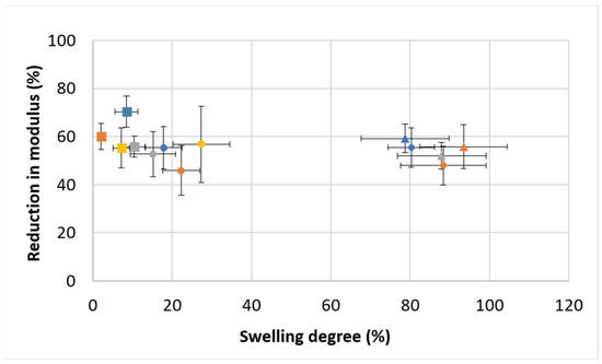 Reduction in compression modulus (%) as affected by the swelling degree. Formulations (Gel-Al-EDC) are represented by different bullet shapes: ● 200–15–10; ■ 200–15–20; ▲300–10–20; ♦ 300–15–20. Foaming ratios (polymer:air) are represented by different colors: blue for non-foamed; orange for 2:1; gray for 1.5:1; yellow for 1:1.