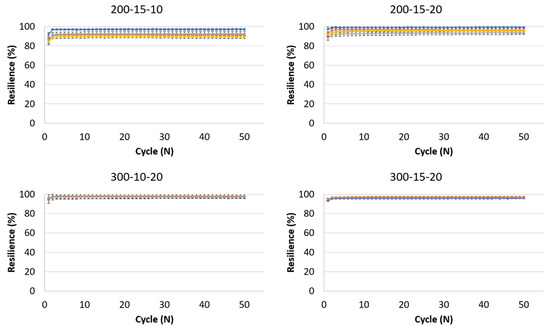 Resilience of the hydrogels during 50 loading and unloading cycles. The formulations are noted above each graph, and foaming ratios (polymer:air) are represented by different colors: ■ non-foamed; ■ 2:1; ■ 1.5:1; ■ 1:1.