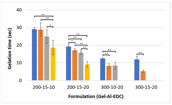 Gelation time of the hydrogels. Different formulations are noted on the x-axis as Gel-Al-EDC. Foaming ratios (polymer:air) are represented by different colors: ■ non-foamed; ■ 2:1; ■ 1.5:1; ■ 1:1. A p value of <0.05 and <0.001 is marked with an * and **, respectively.