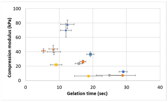 Figure 8 shows the relationship between gelation time and the compression modulus. It is notable that a variety of hydrogels, in terms of gelation times and stiffness (modulus), were obtained using the studied formulations. These include combinations of a high modulus (70–80 kPa) with a short gelation time (12–13 s), a medium modulus (40–44 kPa) with a very short gelation time (5–8 s), a medium modulus (20–27, 34 kPa) with a short or medium gelation time (8–19 s), and a low modulus (7–12 kPa) with a medium or long gelation time (17–28 s). The only hydrogel types that do not exist in the current study are those that combine a high modulus with a long gelation time and a low modulus with a short gelation time.