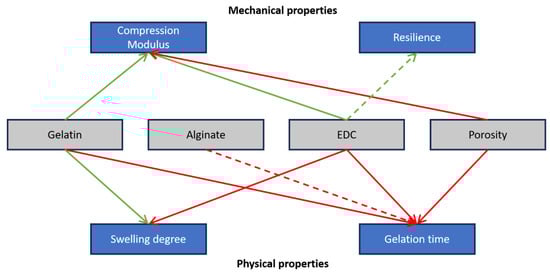 Qualitative model illustrating the relationships between hydrogel components and its properties. Red arrows indicate a decreasing trend, and green arrows indicate an increasing trend. A solid line indicates a strong effect, and a dashed line indicates a weak effect.