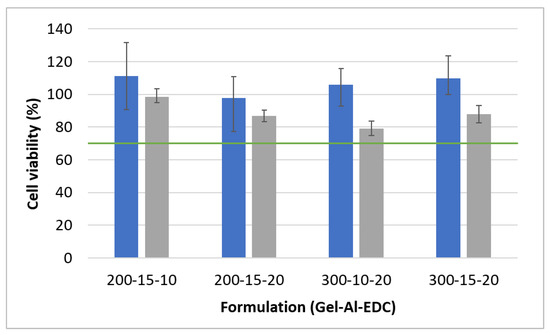 Cell viability of non-foamed hydrogels on human fibroblasts. Blue and gray bars show the results after 24- and 48-h incubation of the cells in hydrogel extracts, respectively. The green line marks 70% viability, which is considered by the FDA as the limit of cytotoxicity.