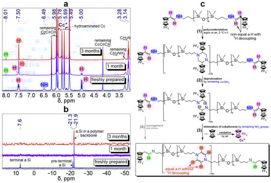 It was found that hydroamination occurs with a “gelation” of the resulting cobaltocenium-containing polysiloxanes. All the cobaltocenium-containing (co)polysiloxanes were brown and red oils, whose mixtures thicken and “gelate” over one week, when stored both in air and an argon atmosphere at r.t. The obtained polymers form high-quality films (Figure S15). Apparently, this is due to the polymer chain lengths increasing and/or cross-linking, caused by the reaction between the two terminal enamine-cobaltocenium groups. According to refs. [34,35], enamines can condense into 1,4-dihydropyrazine derivatives with possible cobaltocenium elimination. It was shown that the NMR spectra (1H and 29Si{1H}) of Cc-APDMS850 and P(Cc-AMS-co-DMS) solutions in acetone-d6 changed significantly after storage in air at r.t. during 1–3 months (Figure 2a,b). After 3 months, they stopped changing.