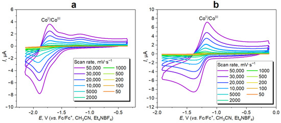 The redox properties of Cc-PDMSs were confirmed by CV. To obtain a detectable electrochemical response, CV was carried out for Cc-APDMS850 with the highest metal content among the investigated polymers (2.0 wt.%, Table S1) in CH3CN solution using a classical three-electrode system under an argon atmosphere. The CV measurements were conducted with various potential scan rates from 0.05 to 50 V·s−1 within the potential range from −1.8 to 0 V vs. Ag|AgNO3 (−0.125 V vs. Fc/Fc+) using 0.1 M Et4NBF4 CH3CN as an electrolyte (Figure 3). In the obtained CVs of the freshly synthesized Cc-APDMS850 (Figure 3a), one pair of reversible oxidation/reduction peaks was observed at E1/2 ≈ −1.8 V, which is associated with the CoII/CoIII transition. The redox activity of the polymer remained at a good level after its storage for 1–3 months at r.t. (Figure 3b), but the redox potential shifted to E1/2 ≈ −1.3 V due to structural changes in the polymer chains described above (Figure 2). The corresponding CoII/CoIII redox potential was similar to that of other cobaltocenium-containing polymers reported in refs [16,28,30,37]. This fact confirms that the redox centers remained in the polymer structure.