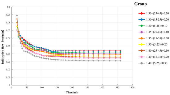 Infiltration flow under multifactor. Note: Each treatment is denoted as “a + b + c”, where “a” indicates the soil bulk density (g/cm3), “b” specifies the γ-PGA burial depth (cm), and “c” represents the γ-PGA application rate (mass percentage). For example, 1.30 + (25–45) + 0.30 indicates a treatment in which 0.30% γ-PGA (by mass) is applied at a burial depth of 25–45 cm in soil with a bulk density of 1.30 g/cm3.
