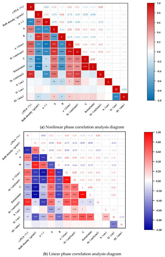 Correlation analysis plot between multifactors and model parameters. Note: * represents a weak statistical significance at the level (p ≤ 0.05); ** represents a higher statistical significance at the level (p ≤ 0.01); *** represents a very high statistical significance at the level (p ≤ 0.001); **** represents an extremely high statistical significance at the level (p ≤ 0.0001). The more asterisks, the greater the significance of the correlation, and smaller correlations are not highlighted. “B” represents γ-PGA (unit: %); “C” represents the bulk density (unit: g/cm3); “D” denotes the water loss rate (n); “E” refers to the volume constant (); “F” indicates the time constant (); “G” signifies the inverse inlet suction (α); “H” stands for the residual moisture content (θr) (unit: cm3/cm3); “I” denotes the soil infiltration rate during the stable infiltration stage () (unit: cm3/(cm·min)); “J” represents the saturated hydraulic conductivity (Ks) (unit: cm/min); “K” stands for the saturated moisture content (θs) (unit: cm3/cm3); “L” represents h (unit: g/cm3); “M” refers to I1 (unit: cm), and represents the cumulative infiltration amount in the nonlinear stage (cm3/cm) in (a); “M” refers to I2 (unit: cm), and represents the cumulative infiltration volume during the stable infiltration stage (cm3/cm) in (b); “N” indicates tI1 (unit: min) in (a); “N” also represents tI2 (unit: min) in (b).