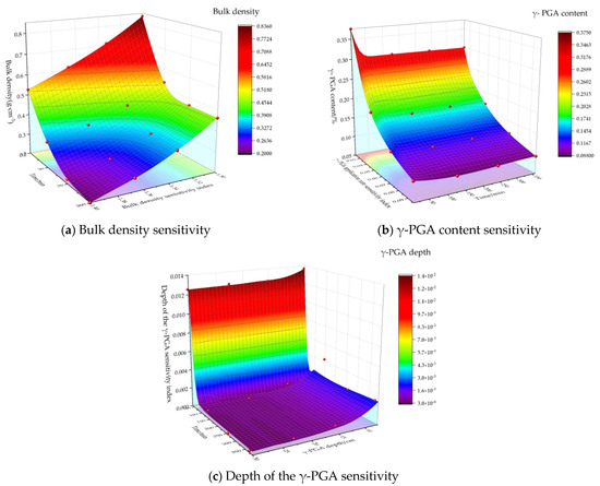 It is apparent that the relationship between the sensitivity index and each influencing factor is negatively correlated. The impact of soil bulk density and γ-PGA content on infiltration rate is significantly greater than that of γ-PGA application depth. Specifically, the soil bulk density had the greatest influence on the infiltration rate, followed by the γ-PGA content sensitivity, with the γ-PGA application depth having the least influence.