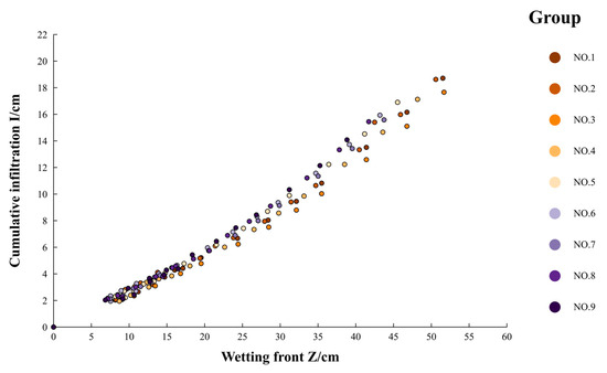 To explore the relationship between the cumulative infiltration amount and the wetting front migration distance, these variables were compared and analyzed through point plotting, and the trend was delineated using points.