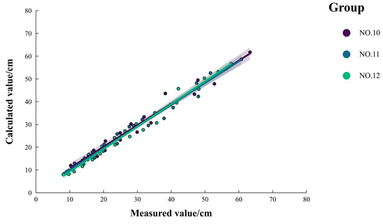 To verify the reliability of this empirical model, the measured data from NO. 10, NO. 11, and NO. 12 were used. As shown in Figure 5, the scatter plot of the calculated versus measured values of cumulative infiltration generally aligns closely with the 1:1 diagonal line. The νRMSE is 0.023 cm, and R2 is 0.983 (p < 0.01), demonstrating the model’s effectiveness in quantitatively describing the relationship between cumulative infiltration and various influencing factors.