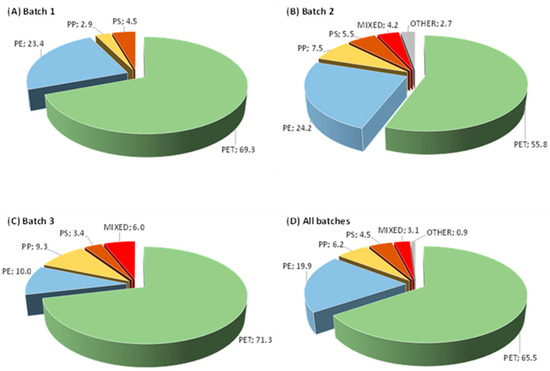 Results of the materials’ identification (wt%) in the different multi-material waste batches (A–C) and average results obtained for all the batches (D).