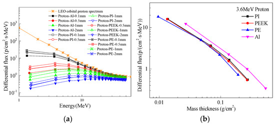 Differential cumulative flux spectra of LEO orbital protons protected by different materials and the same mass thickness: (a) differential cumulative flux spectra after different material and thickness protection; (b) proton protection effect of different materials with the same mass thickness.