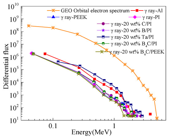 As shown in Figure 3, the differential cumulative flux spectra of secondary gamma photons after different 2 mm material shielding layers in the GEO orbit are depicted. It can be observed from the graph that the secondary particles produced by the 20 wt% Ta/PI composite material are more than those produced by the metal Al. Therefore, metallic Ta is excluded as a filler. The B4C/PEEK composite has a lower secondary photon differential cumulative flux. Based on the above factors, B4C was selected as the strengthening component to prepare a new radiation-shielding composite with different addition amounts of B4C/PEEK.