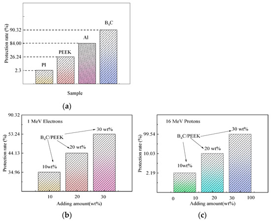 Simulation calculation results of 1 MeV electron and 16 MeV proton protection rate of materials: (a) protective effect of different materials; (b) electronic protective effect of B4C/PEEK at different B4C addition levels; and (c) 16 MeV proton protective effect of B4C/PEEK at different B4C addition levels.